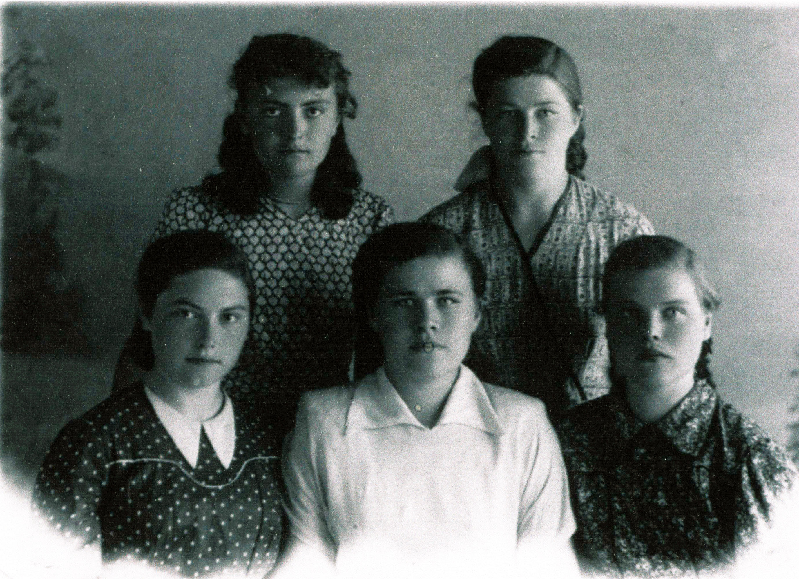 vlnr sitzend: Anna Dyck, Helene Schellenberg, Adina Wiebe, stehend: unbekannt, Susanna Schellenberg