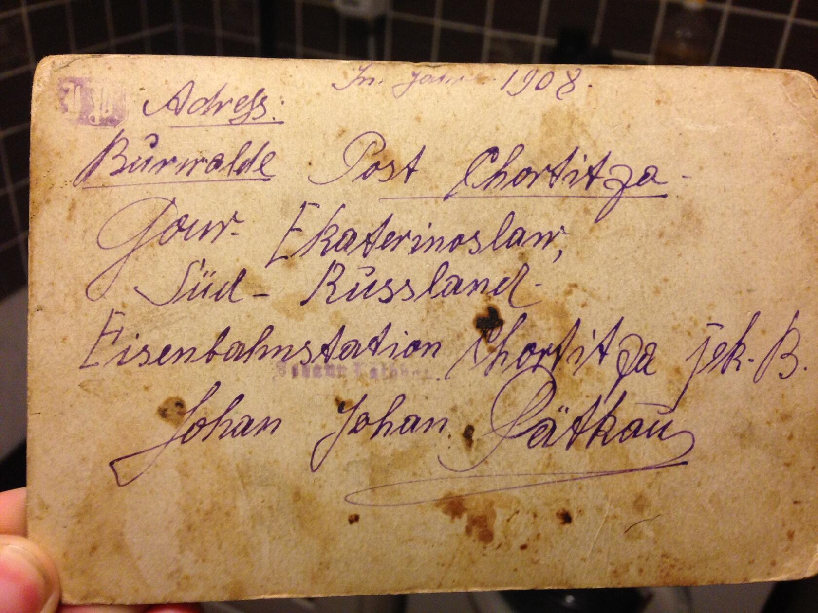 Im Jahr 1908 Adresse Burwalde Post Chortitza Gouv. Ekaterinoslaw, Süd-Russland Eisenbahnstation Chortitza jek.B Johan Johan Pätkau