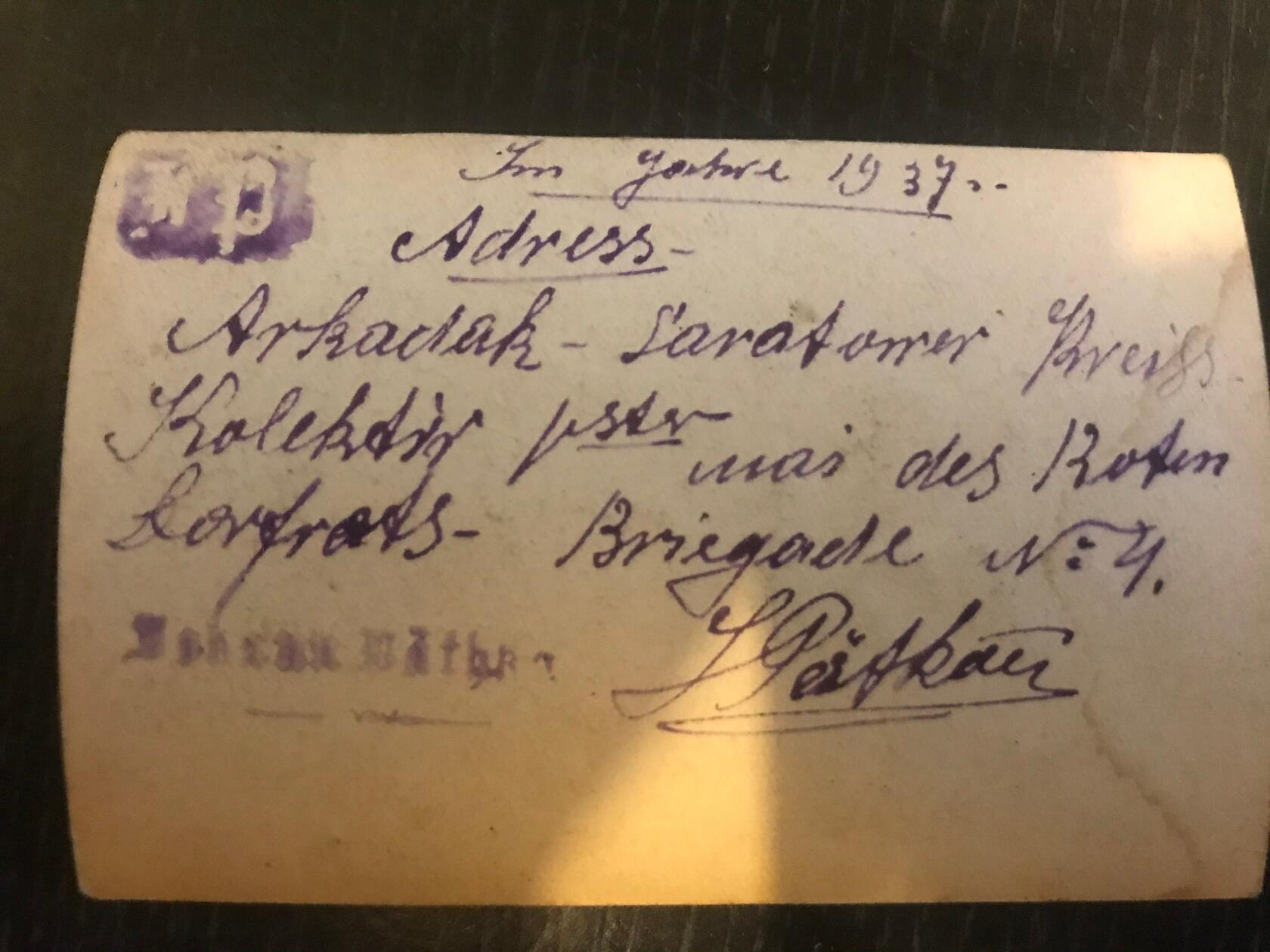 - Im Jahre 1937 Adresse Arkadak - Saratower Kreis Kolektiv ?? des Roten Dorfrats- Briegade N:4 Johann Pätkau Unterschrift JPätkau