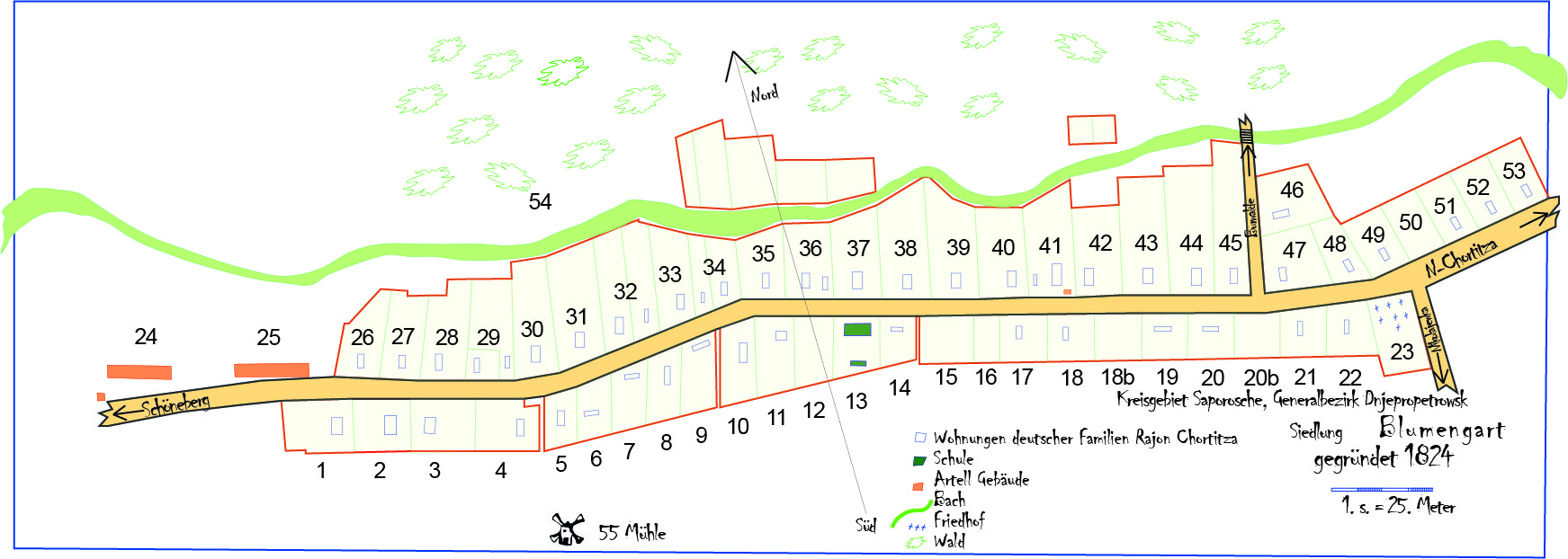 Karte von Blumengart mit den Wirtschaften von 1943 während der Besatzungszeit der Wehrmacht in der Ukraine. Gezeichnet von Hermann Schirmacher nach einer Vorlage der K. Stumpp Gruppe. Zu finden auf der Webseite https://tsdea.archives.gov.ua/ru/