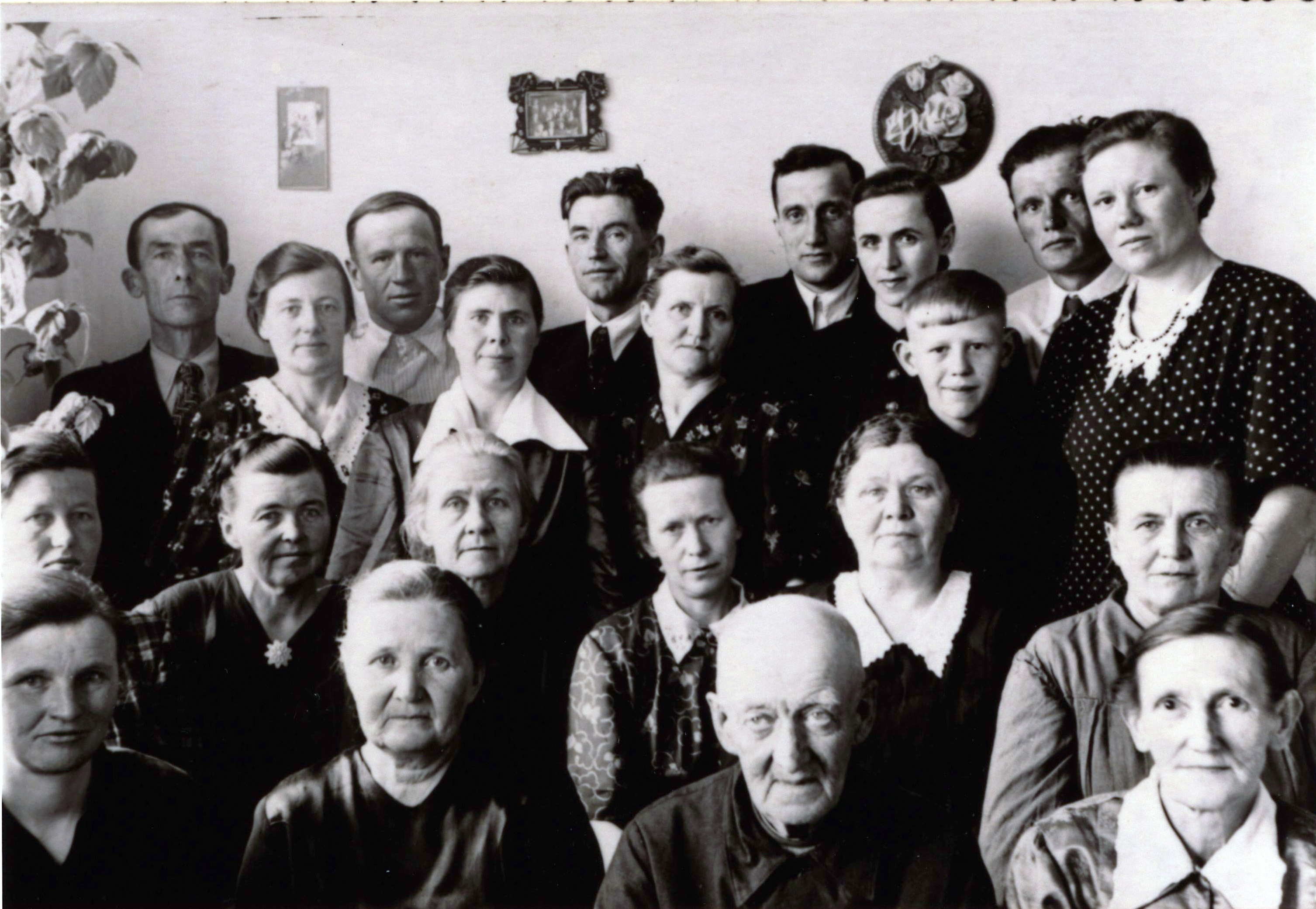 Vlnr hinten: Bernhard Löwen mit Katharina geb. Pätkau, Johann Sehellenberg mit Ehefrau Maria Schellenberg, geb. Zacharias, Johann Redekop und Anganetha geb. Janzen, Karl Stoll mit Hildegard geb. Klassen, Eduard Dyck ledig und Katharina Dyck und Sohn Helmut. Mitte: Helene Peters geb. Klippenstein, Anna Janzen geb. Pätkau, Helene Peters, Elisabeth Janzen geb. Klippenstein, Witwe Susanna Sehellenberg geb. Peters, Witwe Katharina Pauls geb. Klassen. Vorne: Susanna Pätkau geb. Regier, Katharina Peters geb. Pätkau, Peter Pätkau, Katharina Dyck geb. Dyck.