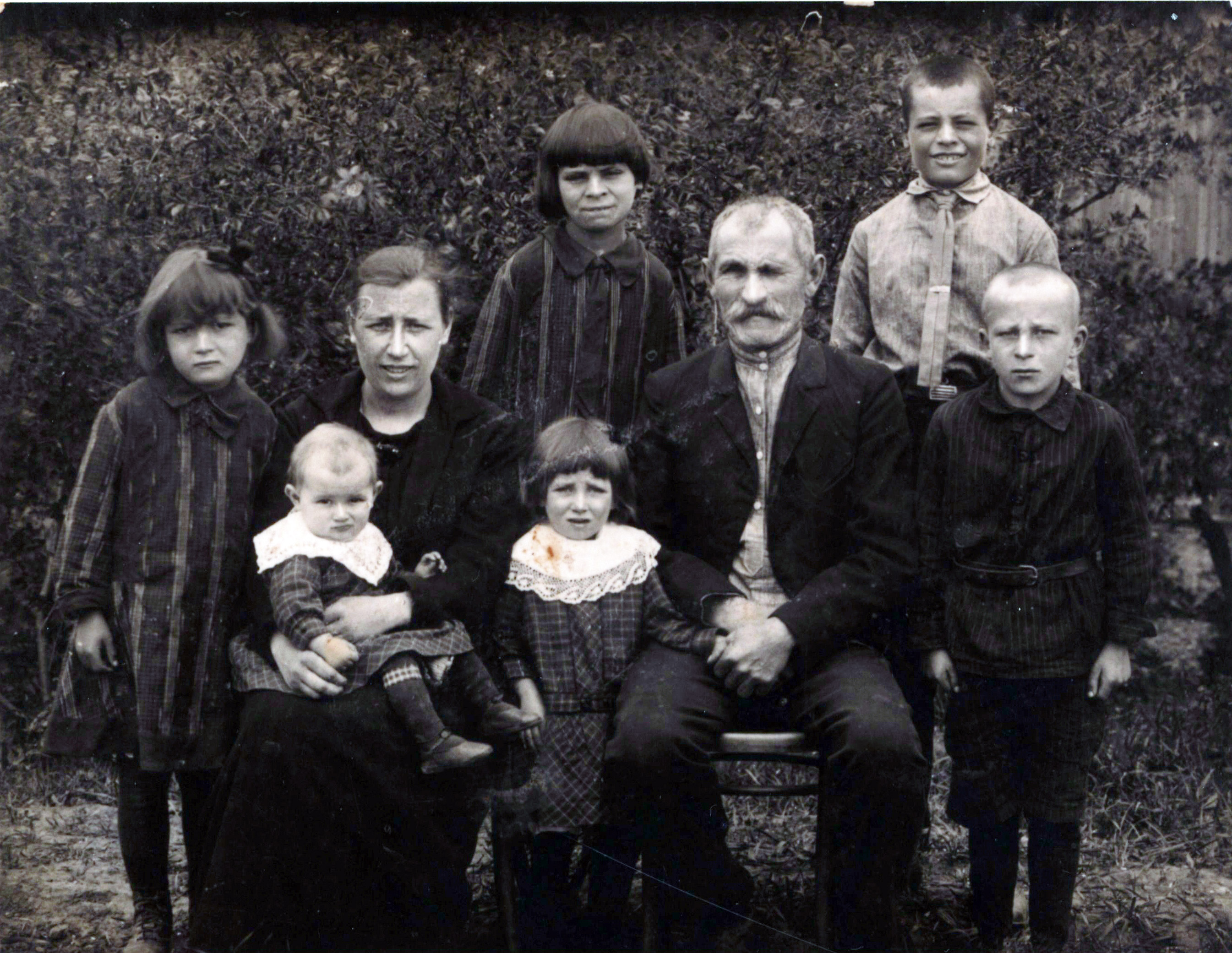 Familie Peter Peters (Müller) vlnr hinten: Justina und Peter (aus 1. Ehe); vorne: Margareta, Mutter Margaretha geb. Klippenstein, Maria (zw. den Eltern), Vater Peter Peters, und neben ihn Johann, auf dem Schoß, ist unbekannt.